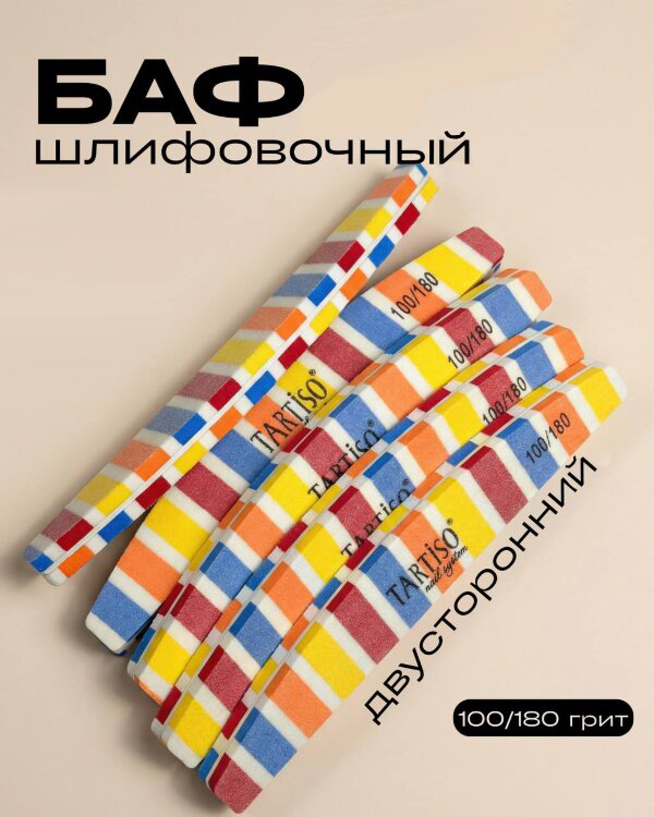 Баф – это многофункциональный инструмент, применяемый для работы с искусственными и натуральными ногтями. С его помощью можно быстро и качественно спилить лишний объём, при наращивании гелем , акрилом, избавиться от неровностей, отшлифовать искусственную ногтевую пластину и придать чёткую форму. Основными функциями этого инструмента являются шлифовка, полировка натуральных и наращенных ногтевых пластин, с которых он удаляет неровности, мелкие изъяны.Характеристики: